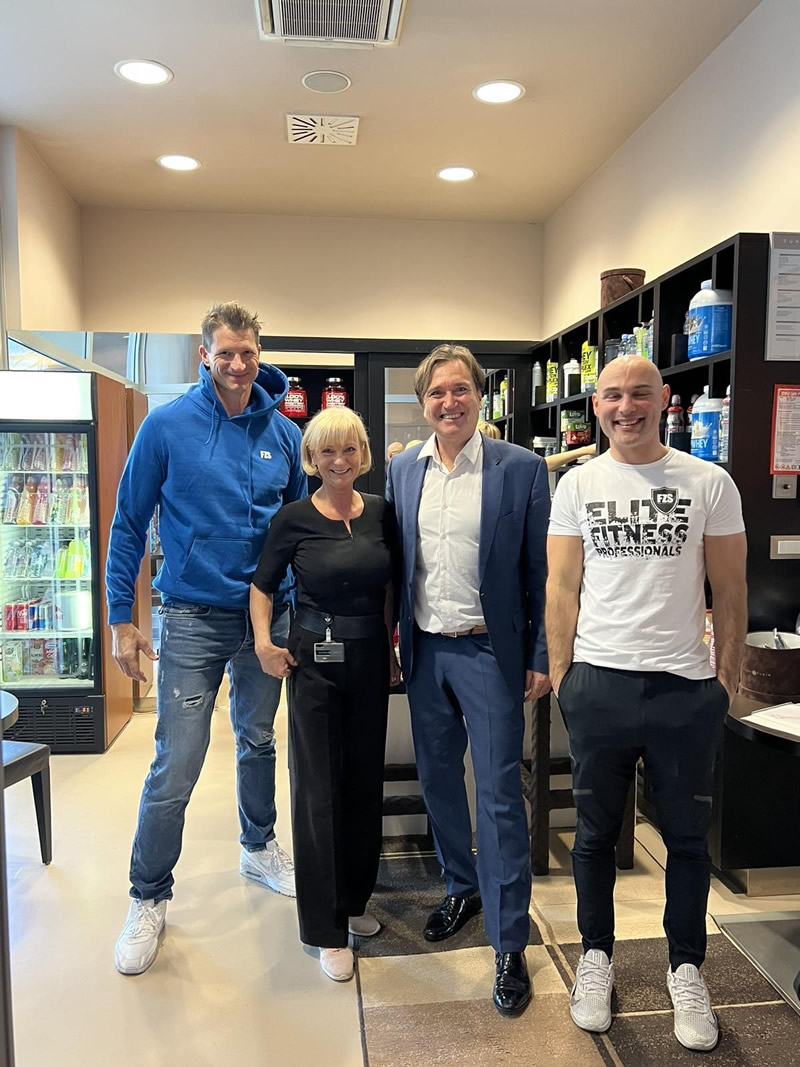 Dr. Bogdan Ambrožič v družbi Tomaža Kuclerja, predsednika Fitnes zveze Slovenija (prvi iz leve), Sonje Poljanšek Škrabec, lastnice fitnesa Sunny Studio (druga iz leve) ter Grege Jenka, osebnega trenerja (prvi iz desne).