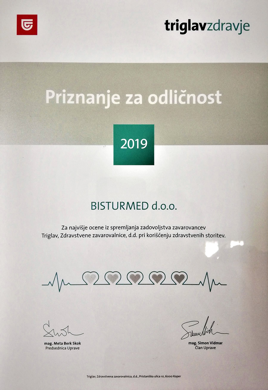 Bisturmed, ortopedska ambulanta in fizioterapija je prejela priznanje odličnosti zavarovalnice Triglav zdravje za izvajanje zdravstvenih storitev v letu 2019